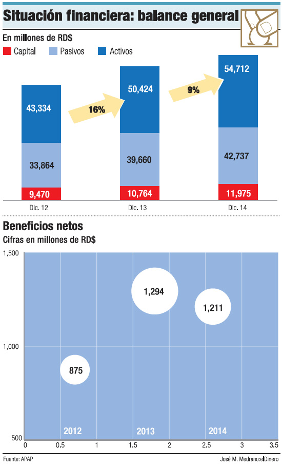 Comunicó que el patrimonio creció con respecto al anterior en RD$1,211 millones, pasando de RD$10,764 millones a RD$11,975 millones, para un crecimiento de 11%. Como resultado de sus operaciones durante 2014, APAP logró beneficios netos por RD$1,211 millones a diciembre 2014.