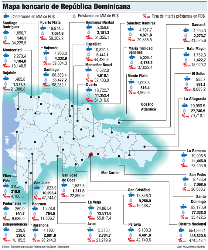 Mientras, los más bajos niveles de préstamos se dan Monte Cristi, con RD$7,948, y Santiago Rodríguez, con RD$9,954, según la Superintendencia de Bancos.