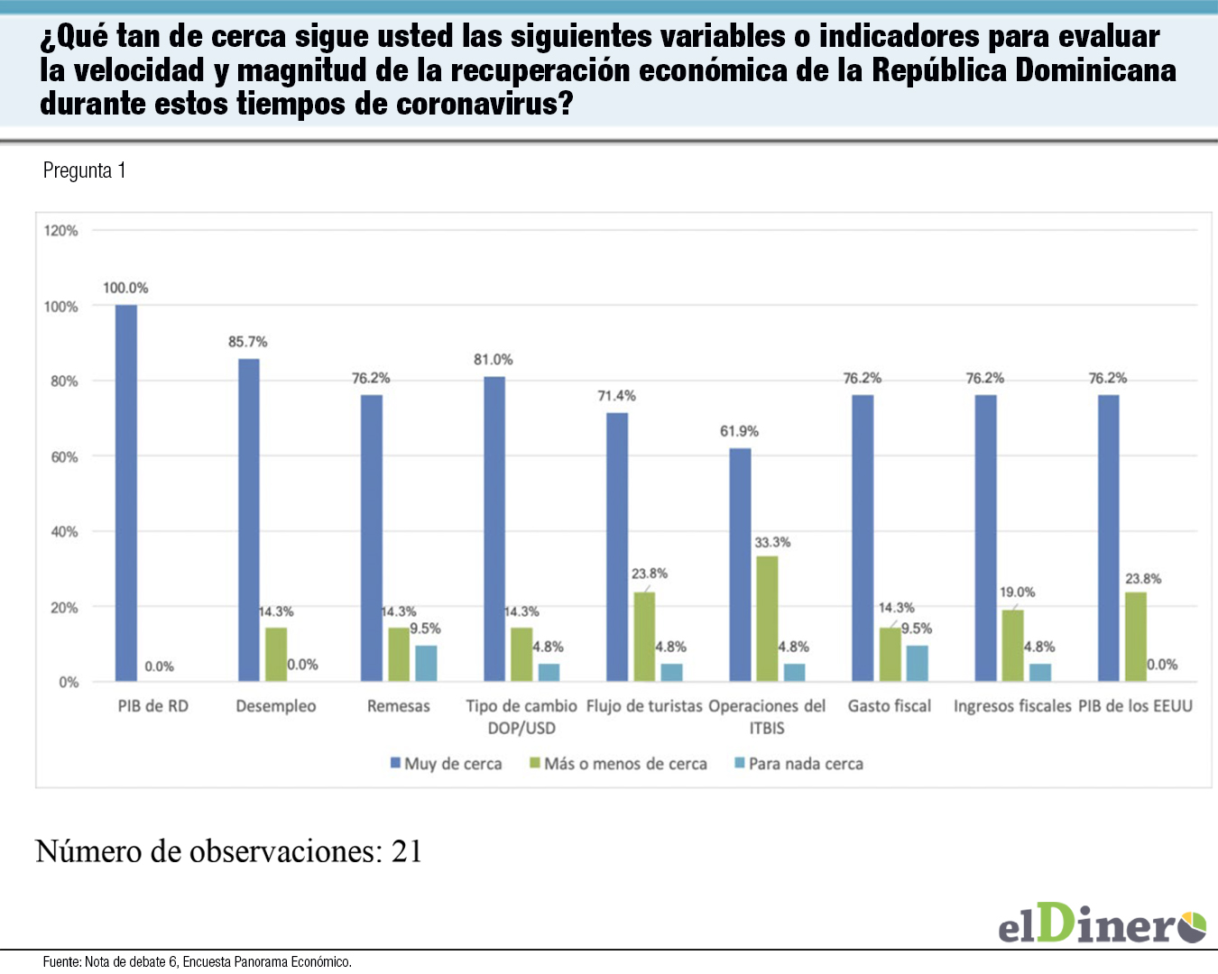 Los economistas consultados siguen “muy de cerca” diversas variables para hacerse una idea del rumbo de la economía impactada por la pandemia. Entre esos indicadores resaltan el PIB (100%), el desempleo (85.7%), el tipo de cambio (81.0%), las remesas (76.2%), , el gasto fiscal (76.2%), los ingresos fiscales (76.2%), el PIB de Estados Unidos (76.2%), el flujo de turistas (71.4%), las operaciones del ITBIS (61.9%).