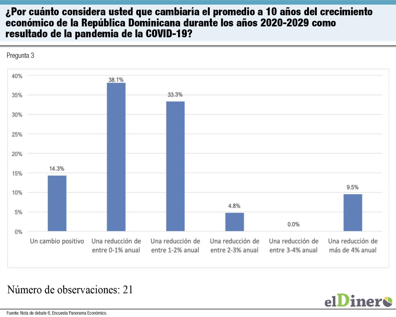 En el documento de la PUCMM, Caffaro y Pérez preguntaron a los economistas su consideración sobre el cambio del promedio a diez años que, como resultado de la pandemia, experimentará el crecimiento económico de República Dominicana entre 2020 y 2029. El 38.1% se inclinó por una reducción de 0 a 1% anual; el el 33.3% estima que de 1-2% y el 9.5% de más de 4%.