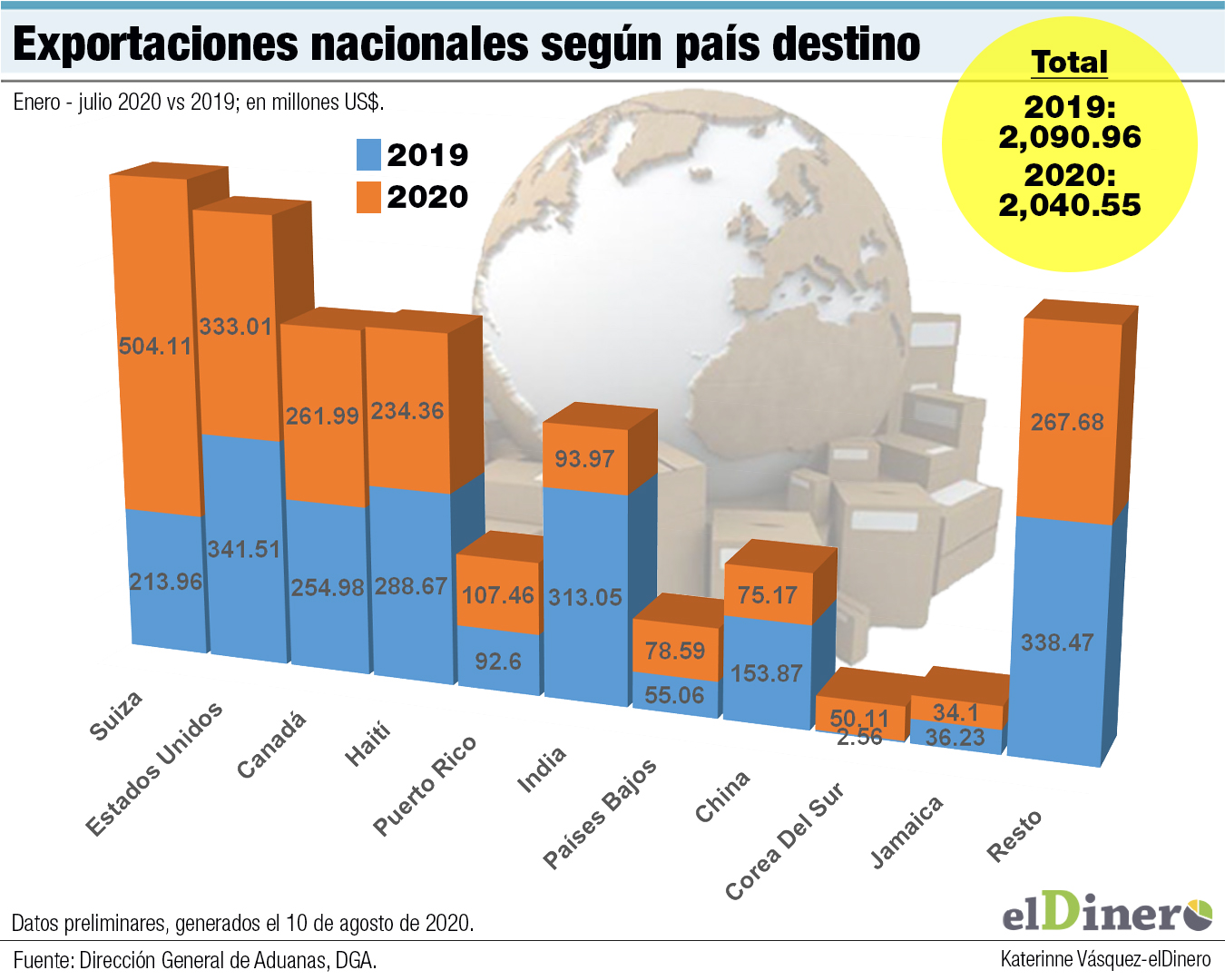 Conforme a los datos del Centro de Exportación e Inversión de la República Dominicana (CEI-RD), los principales destinos de exportaciones totales entre enero y julio lo ocuparon: Estados Unidos con un valor exportado por US$2,632.5 millones, Suiza, con US$510.5millones, Haití, con US$396.1 millones, Canadá, con US$280.1 millones, y Puerto Rico con un total exportado de US$272.8 millones.