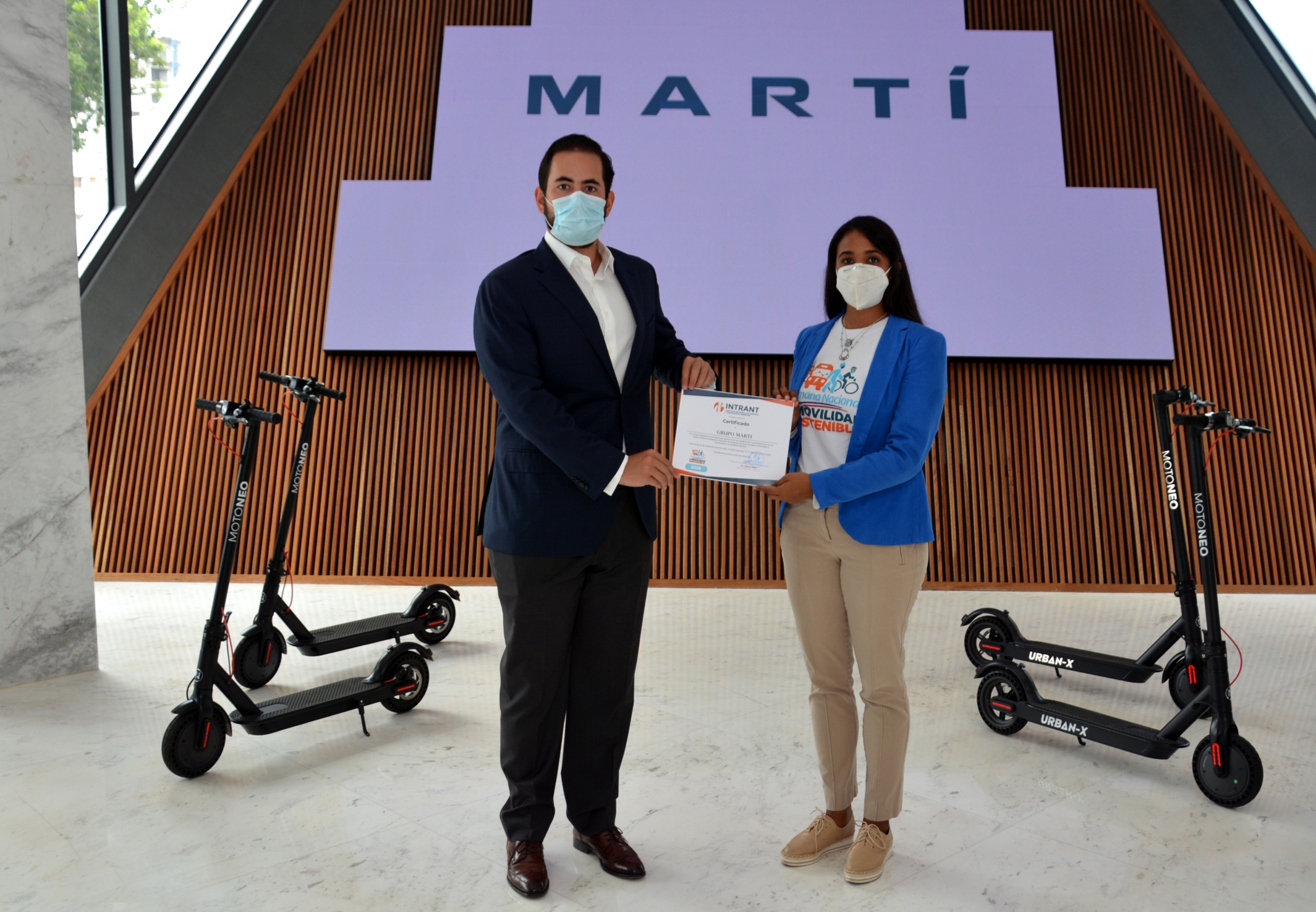 El Instituto Nacional de Tránsito y Transporte Terrestre (Intrant) entregó un certificado de reconocimiento a MARTÍ por incluir iniciativas que incentivan el uso de la movilidad eléctrica en apoyo al desarrollo de la Movilidad Sostenible en República Dominicana.