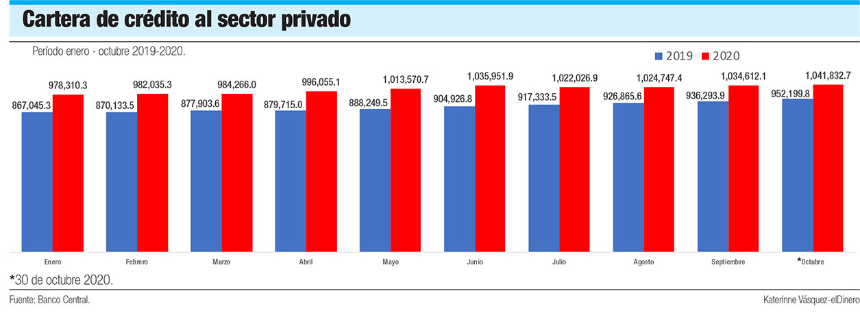 Este año, como consecuencia del covid-19 y a pesar de los esfuerzos realizados por las autoridades monetarias, con un fuerte impulso en los últimos dos meses, el crédito creció en apenas 2.66 puntos porcentuales entre diciembre de 2019 y octubre de este año. Reportes del Banco Central establecen que la cartera de créditos al sector privado pasó de RD$974,889.4 millones a RD$1,041,832.7 millones, lo que significa un aumento neto de RD$66,943.3 millones, equivalente a un 6.87%.