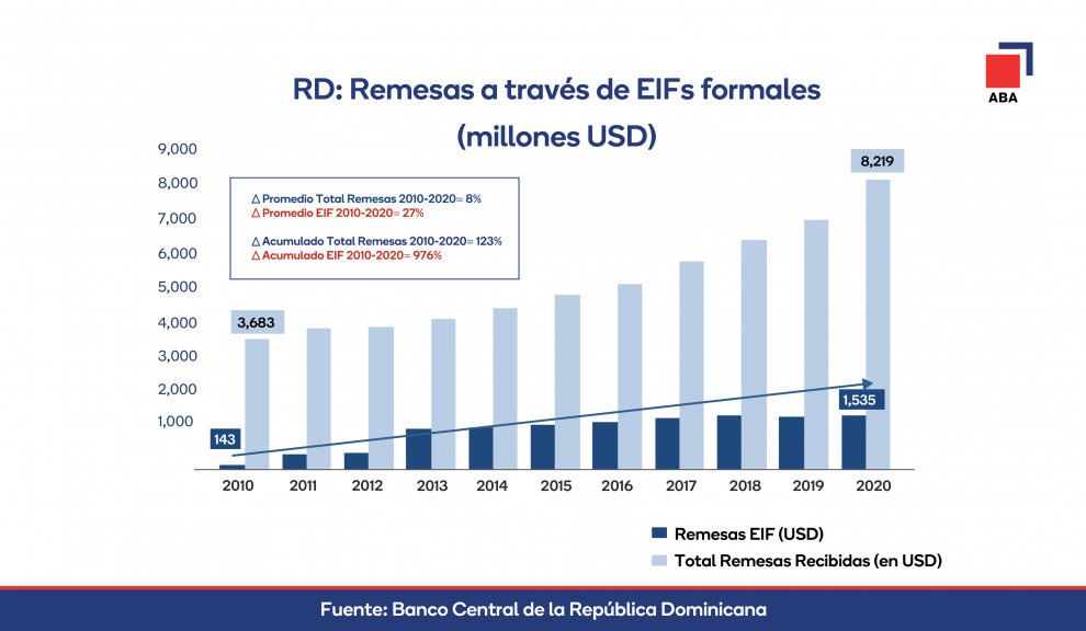 La ABA expresa que, en el contexto de la pandemia, los bancos múltiples se han consolidado como un canal importante para la recepción de remesas, significando para sus usuarios, beneficios como ahorro de tiempos, costos de traslado, mayor seguridad física y cibernética, así como un fomento a la cultura del ahorro de los hogares.