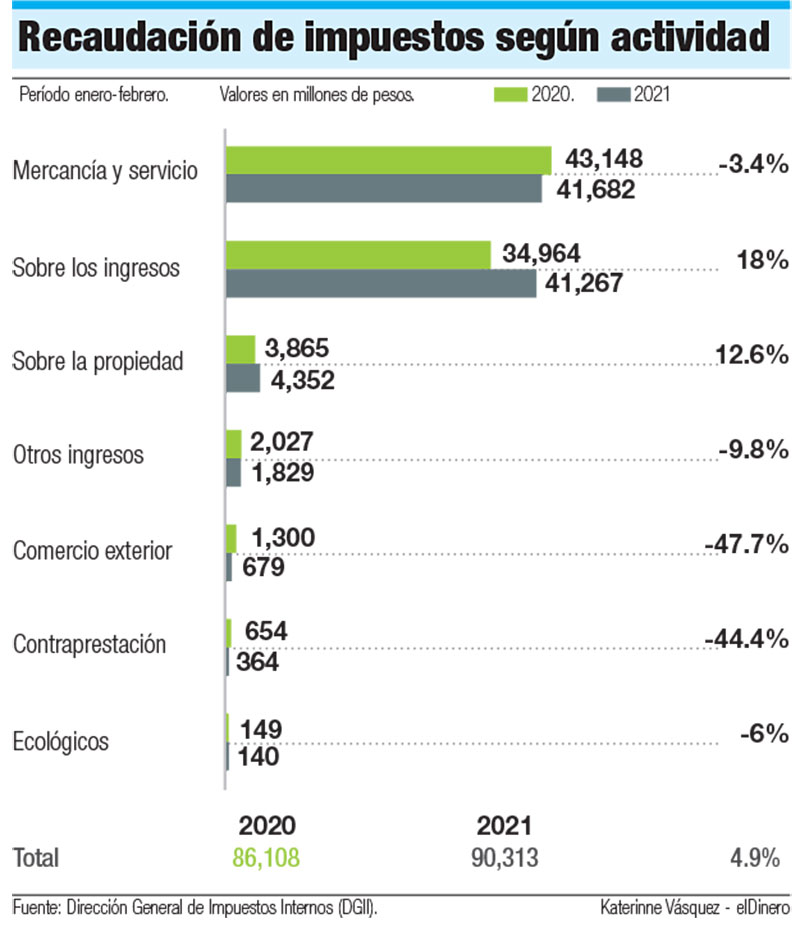 A pesar de que las recaudaciones fiscales acumuladas entre enero y febrero de este año aumentaron casi un 5%, al pasar de RD$86,108 millones a RD$90,313 millones, para una variación de RD$4,205 millones, algunos de sus renglones decrecieron significativamente al compararlos con igual período de 2020.