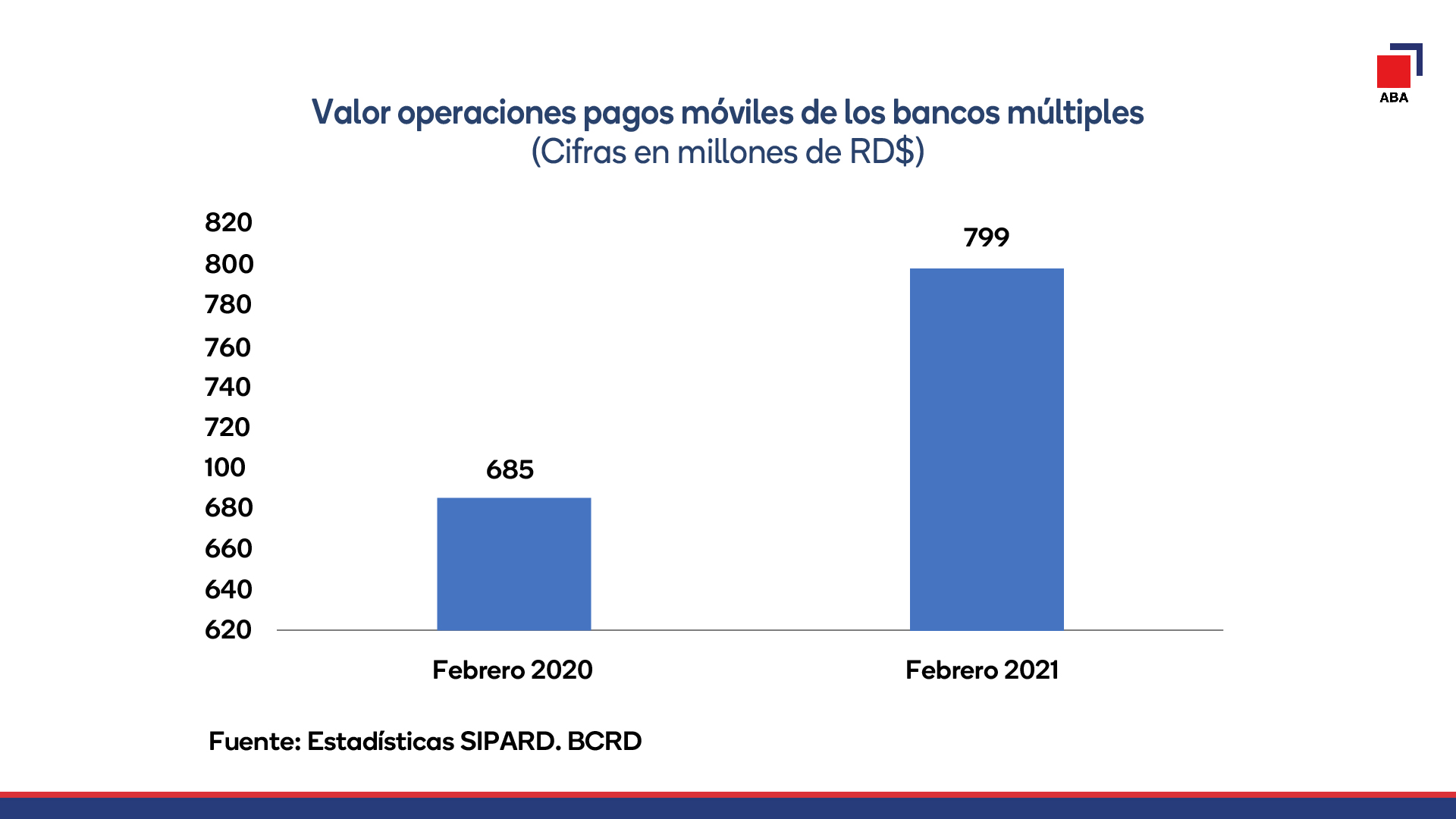 La ABA explicó que el incremento fue de 16.6% en cuanto al valor, es decir, RD$114 millones más que en febrero de 2020, cuando la cifra alcanzó un total de RD$685 millones.