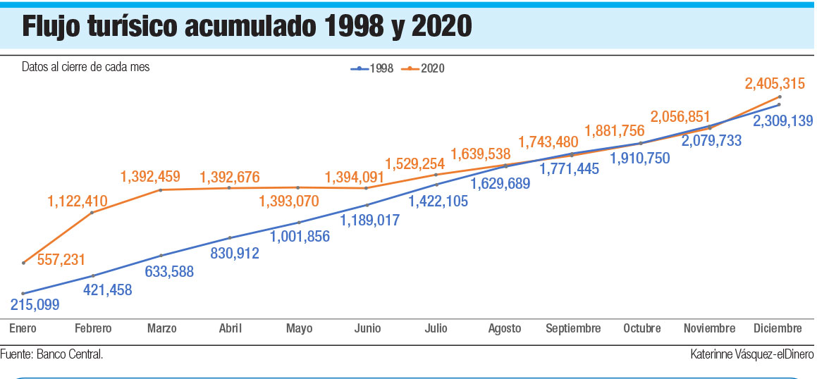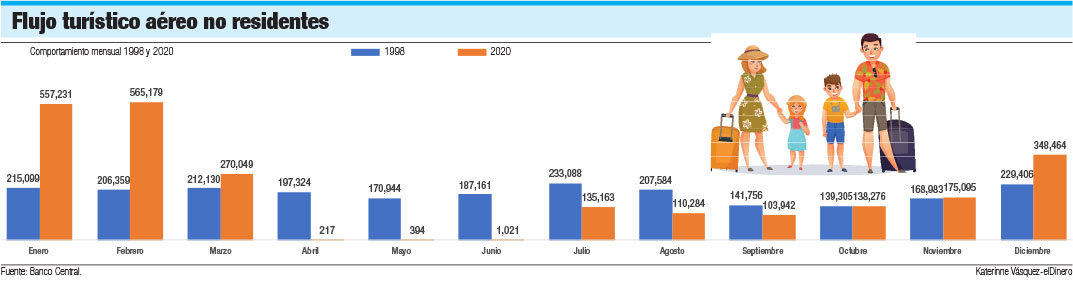 De acuerdo con datos del Banco Central, en por lo menos ocho de los 12 meses el flujo de pasajeros no residentes en 2020 fue superior a 1998, lo que indica que fueron caídas relacionadas con la pandemia las que hicieron retroceder más de 22 años en el tiempo la cantidad de turistas o pasajeros no residentes recibidos en el país. Mientras el crecimiento acumulado en 1998 fue de 4.42%, al cierre de 2020 fue de -62.7%.
