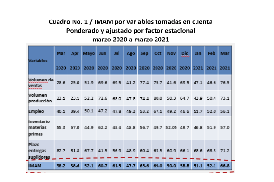 En cuanto a las variables examinadas, estas fueron ponderadas y ajustadas por estacionalidad y al reportar a marzo con relación a febrero 2021 se tiene: “Volumen de Ventas” de 46.6 en febrero a 76.5 en marzo; “Volumen de Producción” se mostró en 50.4 en febrero y pasó a 73.1 en marzo. “Empleo” pasó de 52.0 en febrero a 56.1 en marzo. “Inventario de Materias Primas” pasó de 51.9 en febrero a 57.0 en marzo, y “Plazo Entrega Suplidores” pasó de 68.3 en febrero a 71.2 en marzo. Es decir, que las cinco variables contempladas mostraron una tendencia a la alza en marzo con relación a febrero 2021.