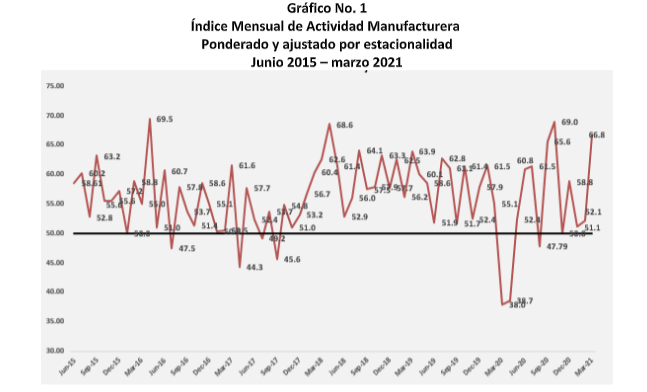 El Índice Mensual de Actividad Manufacturera (IMAM) de la Asociación de Industrias de la República Dominicana (AIRD) ascendió en marzo de 2021 en relación a febrero al pasar de 52.1 a 66.8.