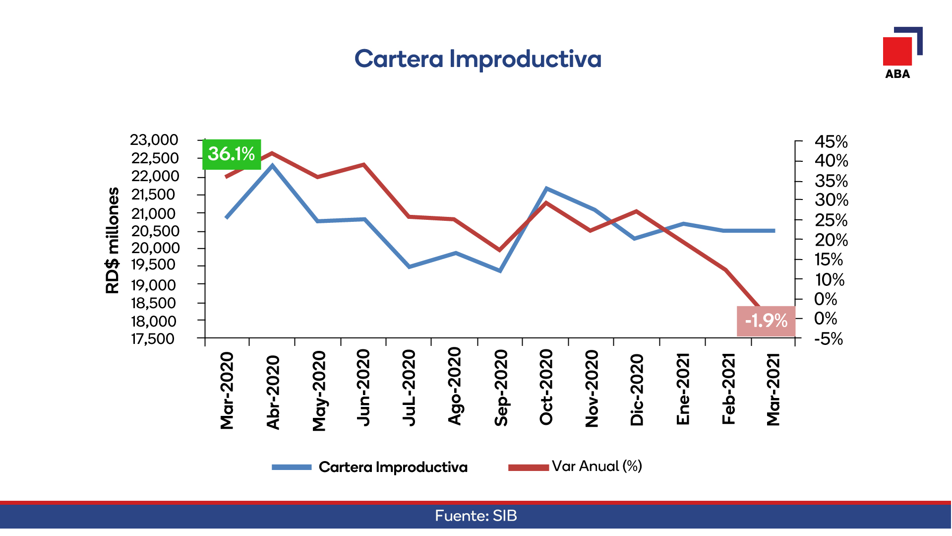 De acuerdo a los análisis de coyuntura de su Dirección de Estudios Económicos, el gremio señaló que, en los tres primeros meses del año, la cartera improductiva (los créditos con atrasos en sus pagos y en cobranza judicial) presentó una caída interanual de -1.9%. Con relación a la cobertura, explicó que la banca múltiple cuenta con RD$2.58 de provisión por cada peso de cartera improductiva, con lo cual se alcanzan máximos históricos en este indicador.