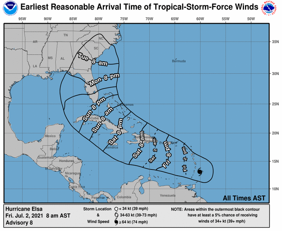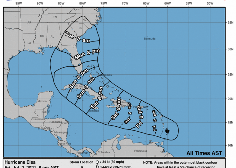 Elsa se situaba en la mañana del viernes cerca de San Vicente y las Granadinas, tras pasar por Barbados con vientos sostenidos de 75 millas por hora (120 km/h).