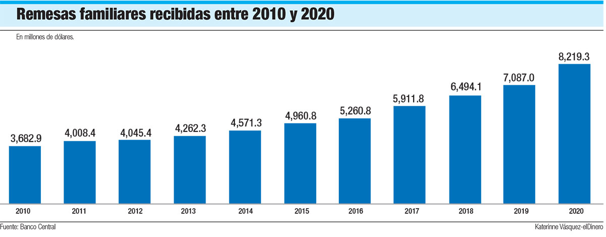 Un estudio la Comisión Económica para América Latina y el Caribe (Cepal), titulado “Fomento de la inversión de las remesas familiares en cadenas de valor: estudios de casos de El Salvador, Guatemala y República Dominicana”, señala que los flujos hacia los países de la región terminarían 2020 en US$33,950 millones, un crecimiento del 8% respecto a 2019.