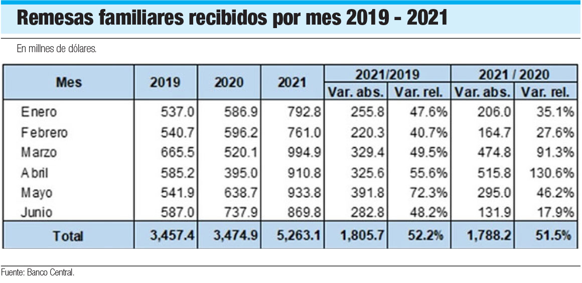 De los US$5,263.1 millones reportados en remesas familiares en los primeros seis meses de este año, US$4,473.6 millones fue desde Estados Unidos (85%), lo que representa un aumento neto de US$1,519.9 millones frente a los US$2,953.7 millones de igual período de 2020, para un 51.5%. Desde España, el segundo país por el monto de envíos, llegaron US$363.2 millones en el primer semestre de 2021 y US$239.8 millones en enero-junio del año pasado. Los datos están calculados en base los porcentajes que publica el Banco Central en su informe cortado a junio.