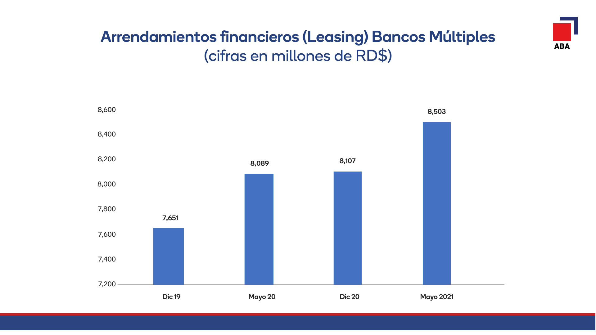 Por su parte, la ABA informó que los arrendamientos financieros (leasing) de los bancos múltiples alcanzaron los RD$8,503 millones al finalizar el mes de mayo, lo que significó un incremento de RD$395 millones durante los primeros cinco meses de 2021, equivalente a un crecimiento de 4.9%.