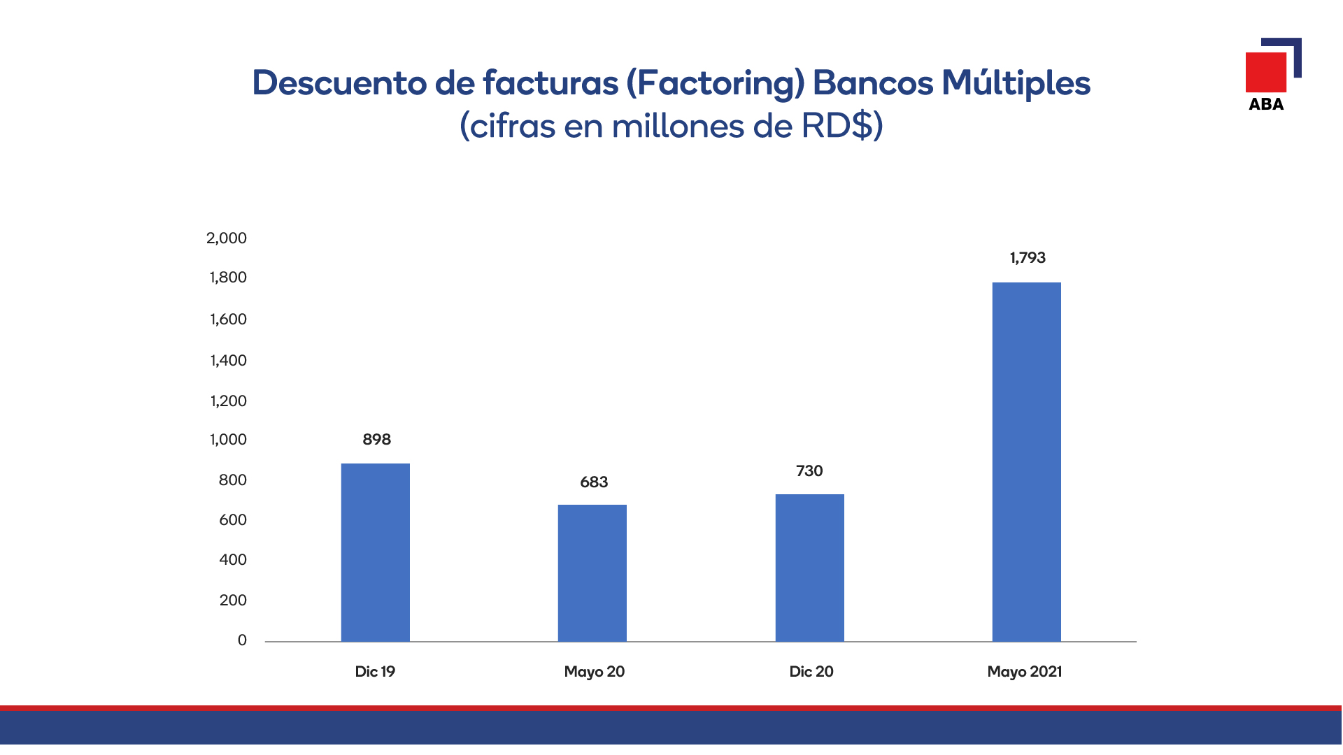 Entre enero y mayo del año en curso, los bancos múltiples incrementaron en RD$1,063 millones, que representan un 145.5%, los descuentos aplicados a las empresas mediante la modalidad de factoring (descuento de facturas), lo cual evidencia una consistente recuperación en las actividades económicas que utilizan este producto financiero.