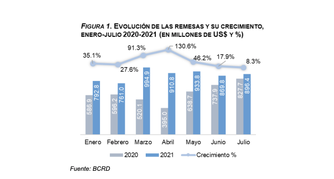 La institución resalta que, al contrastarlas con julio de 2019, año previo a la pandemia, las remesas de julio 2021 exhibieron un crecimiento de 40%, unos US$256.1 millones más.