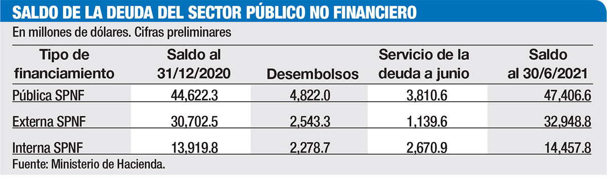 ¿Qué dicen ahora las estadísticas del Ministerio de Hacienda respecto al nivel de endeudamiento? El saldo de la deuda del SPNF al 31 de diciembre de 2020 era de US$44,622.3 millones, mientras que al 30 de junio de este año el montó cerró en US$47,406.6 millones, es decir, US$2,784.3 millones más, lo que equivale a un 6.2% de aumento relativo en los primeros seis meses de 2021.