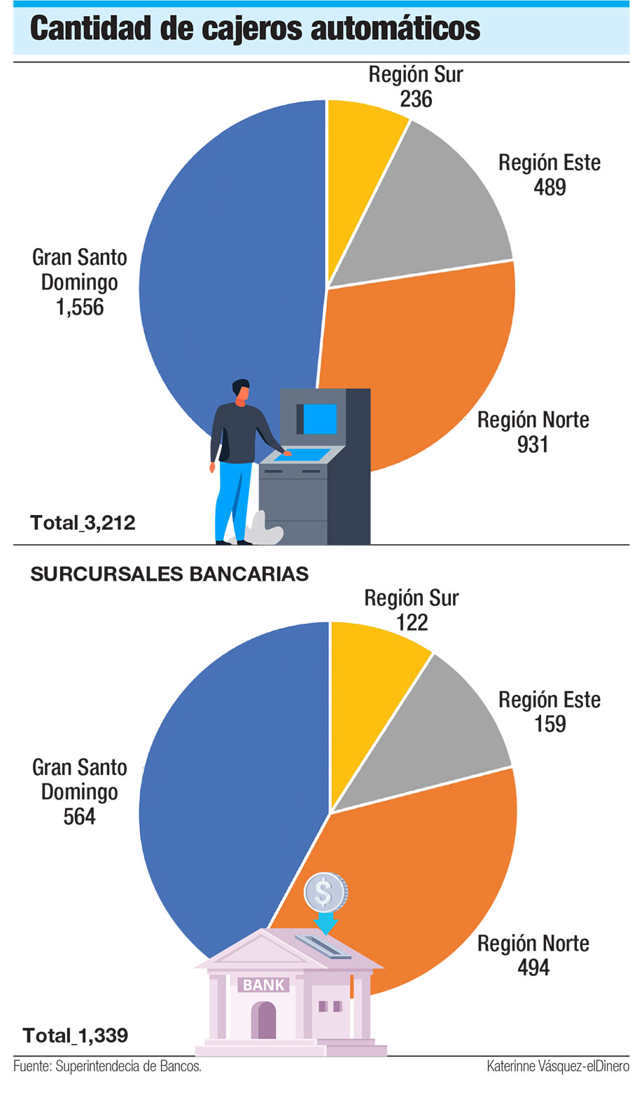 De acuerdo con los datos oficiales, el sistema financiero cuenta con 1,339 oficinas, y solo en la Zona Metropolitana se encuentran 564, lo que equivale al 42%, mientras que 377 se registran en el Distrito Nacional, es decir, el 28%.