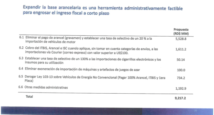 La propuesta del Gobierno dominicano para aumentar las recaudaciones estatales a través de una reforma fiscal establecerá una expansión de la base arancelaria, la que considera “una herramienta administrativamente factible para engrosar el ingreso fiscal a corto plazo”.