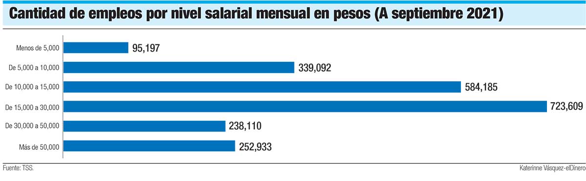 Las estadísticas de la Tesorería de la Seguridad Social (TSS), indican que a septiembre de este año hay 2,233,126 empleos formales cotizantes, de los cuales 95,197 fueron reportados con ingresos por debajo de los RD$5,000 mensuales, mientras que otros 339,092 aparecen con salarios entre RD$5,000 y RD$10,000.