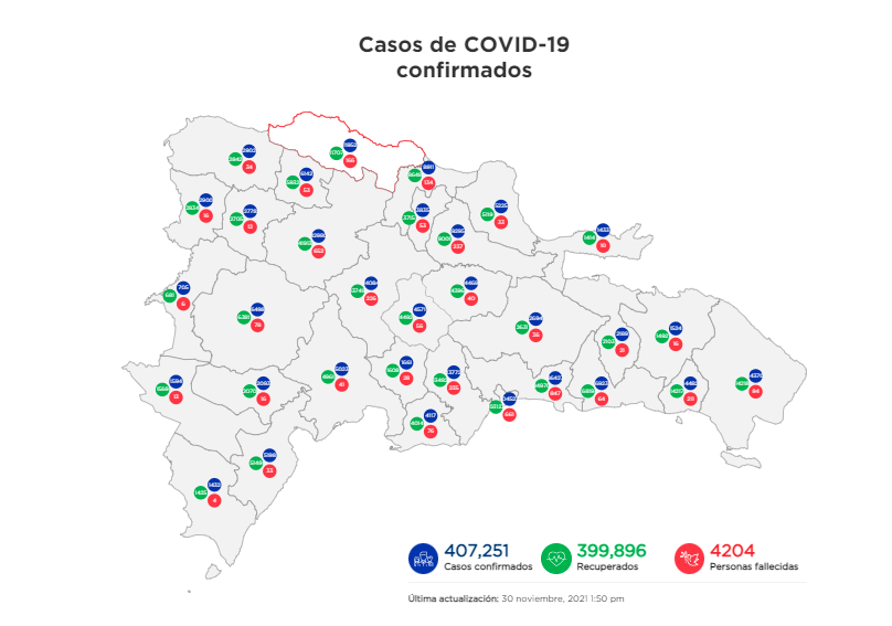 A casi dos años del primer caso confirmado de covid-19 en República Dominicana y con el temor de que llegue a suelo dominicano la Ómicron, nueva mutación del virus, el Ministerio de Salud Pública reporta un total de 407,251 casos de coronavirus confirmados, 399,896 recuperados y 4,204 personas fallecidas.
