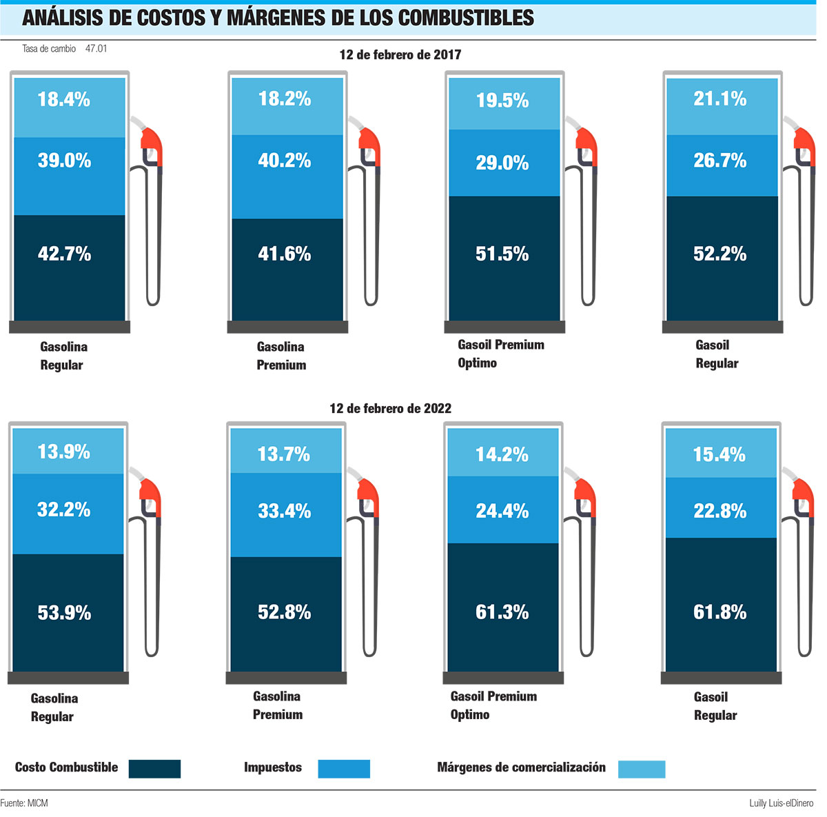 Para el distribuidor eran RD$12.6, detallista RD$20.19 y transporte RD$5.68. El cálculo establece que los impuestos suman RD$77.4 (39.0% del precio total), mientras que entre margen, costos y gastos de comercialización fueron RD$36.47 (18.4%). El costo del combustible (RD$84.83) equivalía al 42.70%. El precio total fue de RD$198.7 por galón.Este mismo combustible, ahora en febrero de este año, arrojó los siguientes datos: El PPI fue de RD$145.78 (53.9%), impuestos RD$87.15 (32.2%) y el margen, costos y gastos de comercialización sumaron RD$37.57 (13.9%). El precio total por galón es de RD$270.5, lo que significa un aumento neto de RD$71.80, equivalente a un 36.1%.