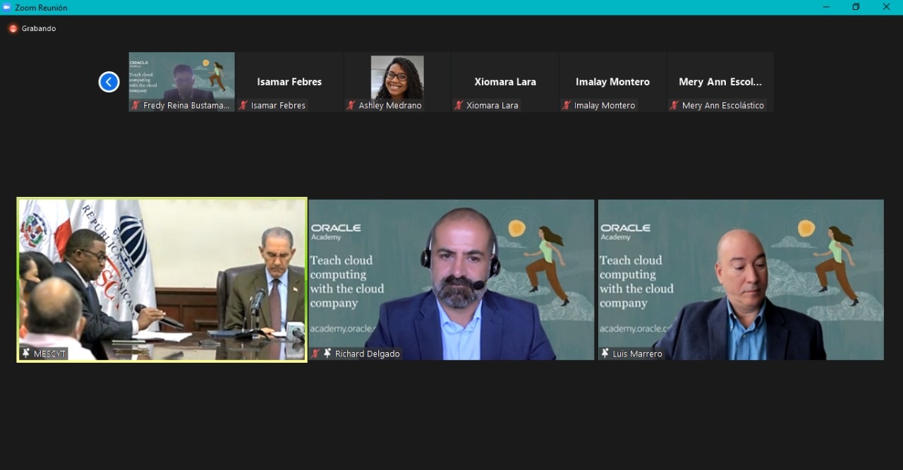 La firma de este convenio se llevó a cabo virtualmente y contó con la participación del ministro del Mescyt, Franklin García Fermín; el viceministro de Ciencia y Tecnología del Mescyt, Genaro Rodríguez; el gerente general de Oracle en la región del Caribe, Luis Marrero; el director de Oracle Academy para Latinoamérica, Richard Delgado, y la gerente en el país de Oracle Academy para el Caribe y Centroamérica, Raelly Muñoz Suárez.