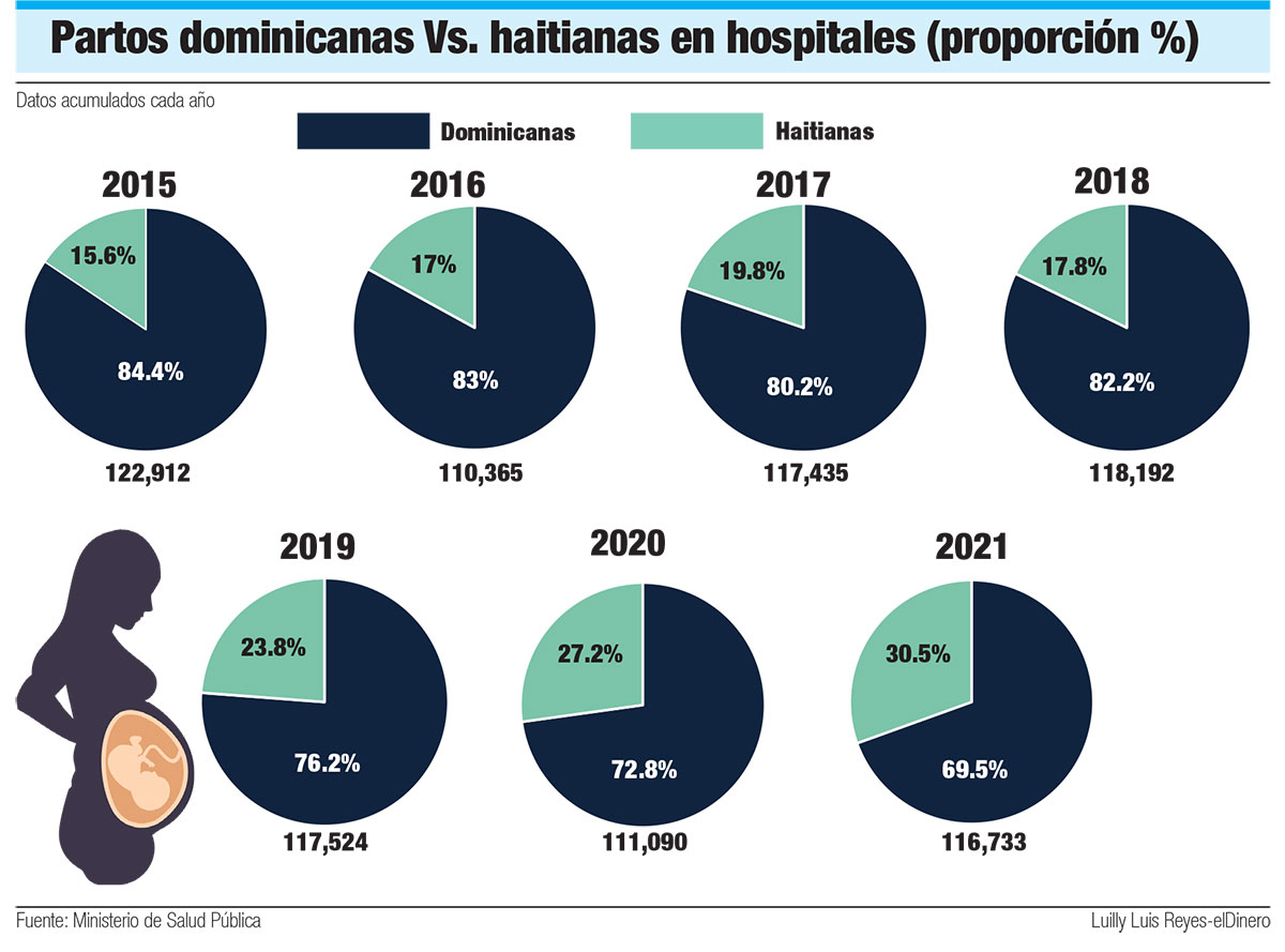 La frecuencia de partos de madres haitianas en hospitales públicos va en crecimiento. En los últimos siete años, de 2015 al 2021, los partos de haitianas aumentan en forma escalonada de 19,112 hasta 35,662, pasando de representar un 17% a un 30.5% al cierre del año pasado.