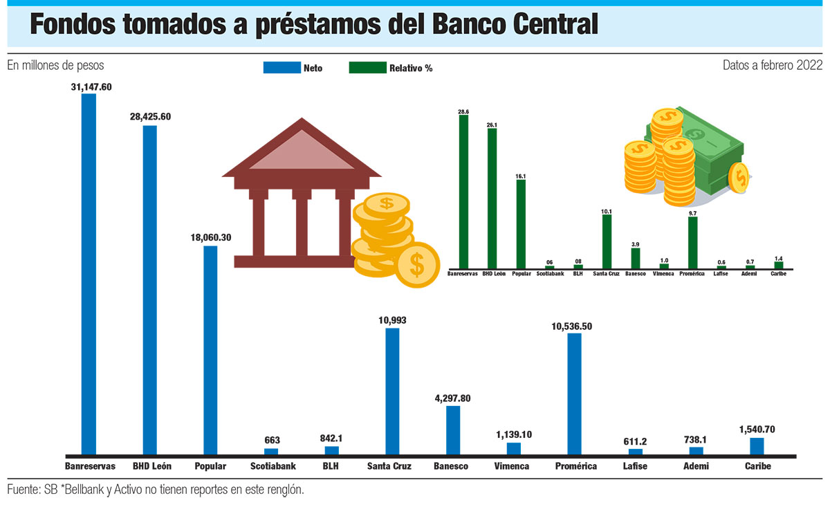 El Banco de Reservas, con RD$31,147.6 millones (28.6%) tiene la mayor ponderación en este renglón, seguido del BHD León con RD$28,425.6 millones (26.1%). En tercer lugar está el Popular con una deuda ascendente a RD$18,060.3 millones, equivalente a un 16.6%, luego está el Santa Cruz, cuyo monto llega a RD$10,993 millones, para un 10.1%. Los únicos bancos que no han tomado fondos prestados del Banco Central son Bellbank y Activo.