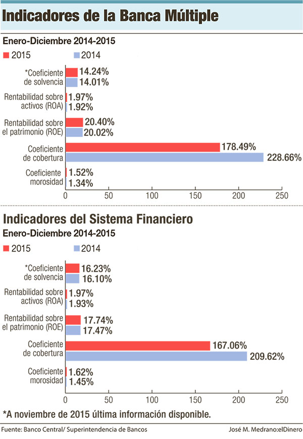 Entre agosto y diciembre de 2015 el crédito a la industria manufacturera pasó de RD$49,638 millones (6.8%) a RD$56,282.4 millones, equivalentes a un 7.5%. El crédito en moneda extranjera, que cerró 2015 en RD$174,414.4 millones, representó el 28.1% del financiamiento en moneda nacional (RD$621,016.4 millones), pero el 21.9% cuando se compara con la cartera consolidada.