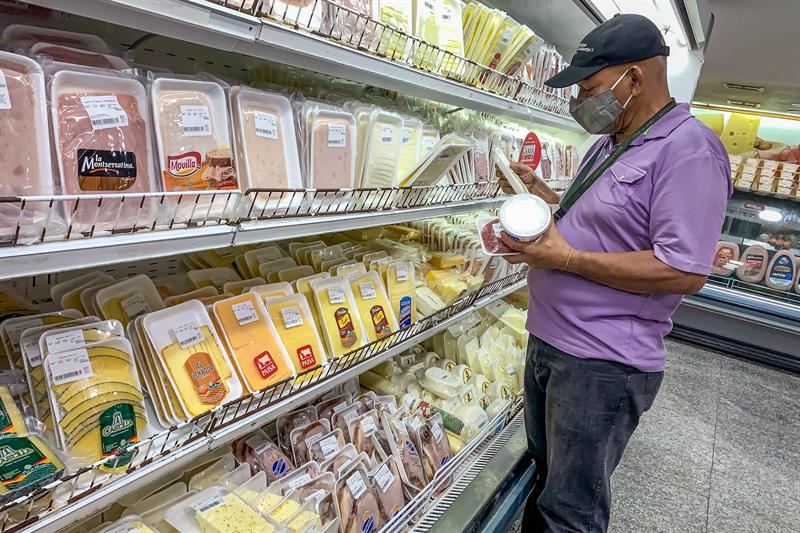 Un hombre escoge productos en una nevera de productos de carnes frías en un supermercado en Caracas, Venezuela. | Miguel Gutiérrez, EFE.