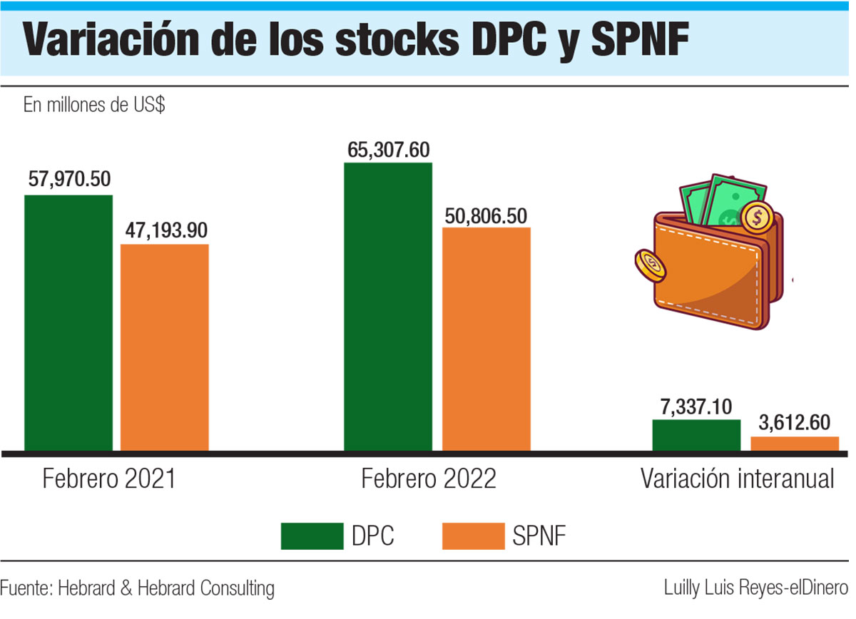 La deuda del Sector Público No Financiero (SPNF), que excluye las entidades financieras del Estado, especialmente la del Banco Central, así como de las instituciones estatales descentralizadas y autónomas no financieras y de los gobiernos municipales, registró un aumento de US$3,612.6 millones en los últimos 12 meses hasta febrero. Así, pasó de situarse en US$47,193.9 millones en febrero del 2021 a US$50,806.5 millones en igual período del 2022, para un aumento de 7.7% en un año.