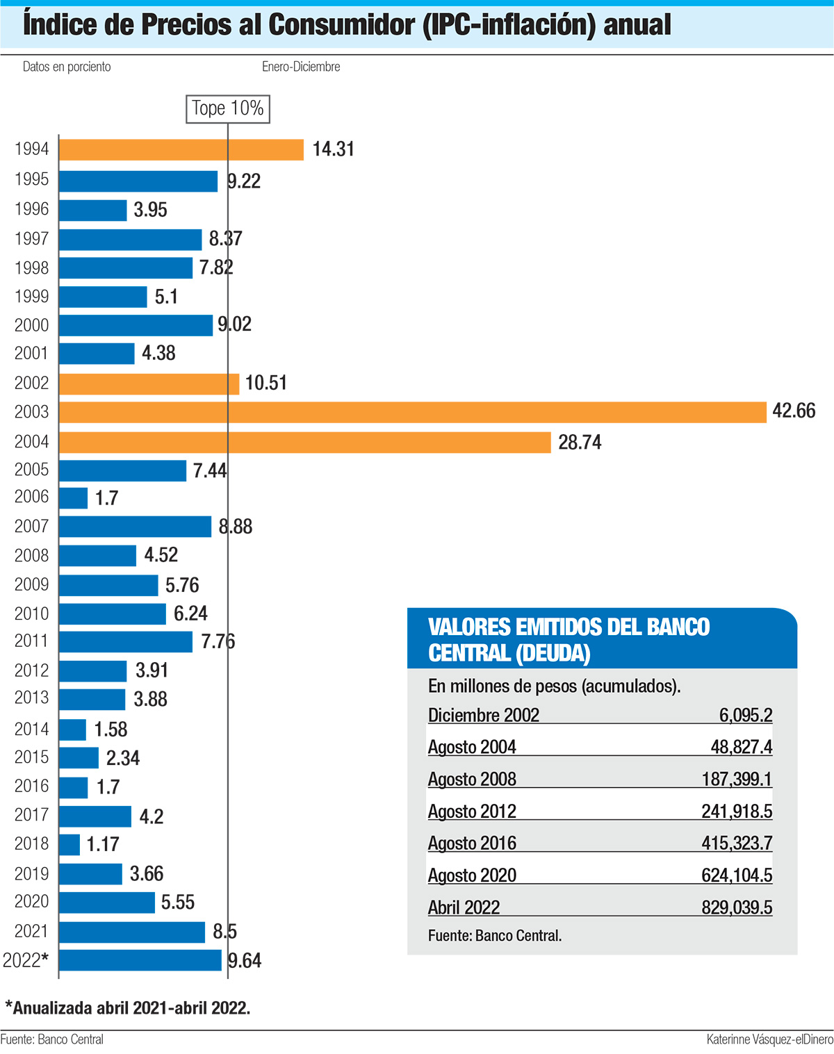 El rango meta establecido por el Banco Central para este año es de que la inflación se mantenga en 4% +/- 1, es decir, entre 3% y 5%. Sin embargo, el IPC anualizado abril 2021-abril 2022 está en 9.64%. Esto es, casi el doble del tope máximo deseado.