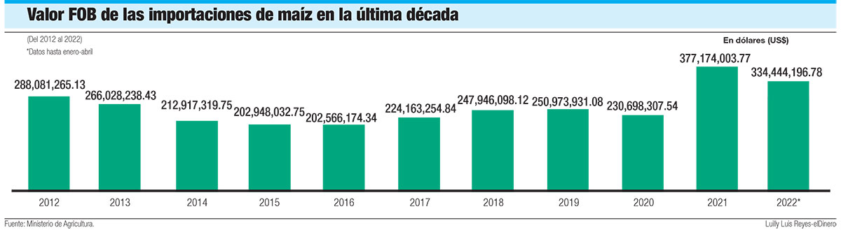 Esta tendencia alcista se mantiene desde el año pasado, cuando en 2021 el costo del maíz superó en un 150% el promedio de la última década. El volumen importado se disparó así a US$377.2 millones, US$146 millones más que en 2020–cuando totalizó US$230.7 millones– y US$89 millones más que en 2012, la última vez que el país destinó más divisas para su compra, con US$288.1 millones.