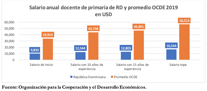 El monto de remuneración cambia cuando el profesional tiene más de 10 años de experiencia. Para los maestros internacionales, esto es de US$43,738 anualmente y US$12,544 los dominicanos. La OCDE indica que los profesores nacionales y extranjeros recibirán US$12,803 y US$46,801 cada año, respectivamente.