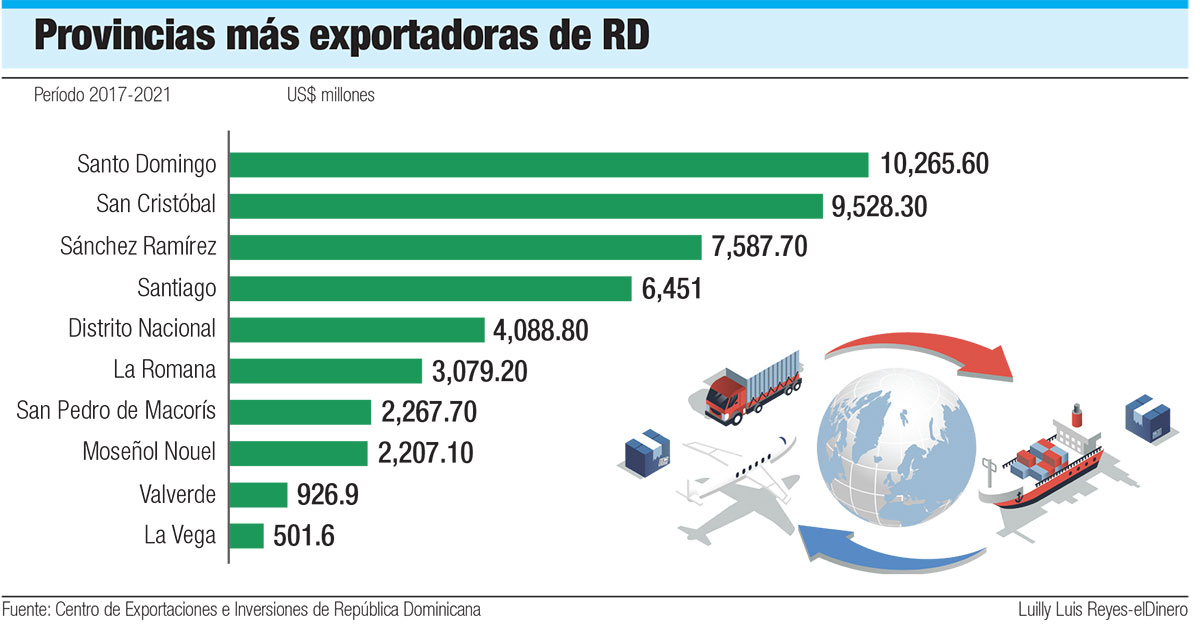 De acuerdo a ProDominicana, la provincia Santo Domingo es la principal demarcación del país exportadora con US$10,265.6 millones, equivalente a un 21% del período 2017-2021. En segundo lugar, está San Cristóbal al reportar US$9,528 millones, es decir, una ponderación de 19.1%. Le sigue Sánchez Ramírez tras registrar alrededor de US$7,587.7 millones, para un 15.2%.