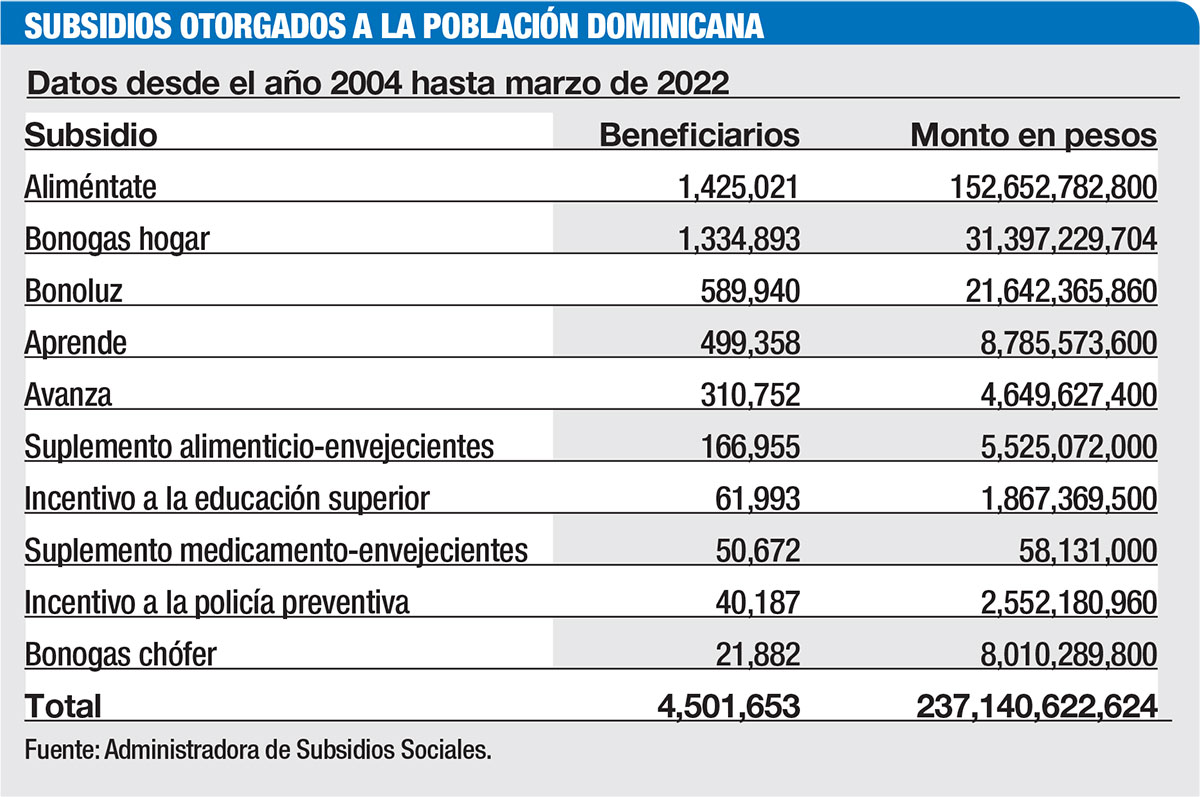 Ante esta problemática, el Gobierno dominicano ejecuta 10 programas sociales que contribuyen a reducir la pobreza en este segmento de la población. Sin embargo, estos programas representan una carga económica para el fisco. Entre 2004 y marzo de 2022, la Administradora de Subsidios Sociales (Adess) registra un monto otorgado de RD$237,140.6 millones a 4,501,653 beneficiarios.