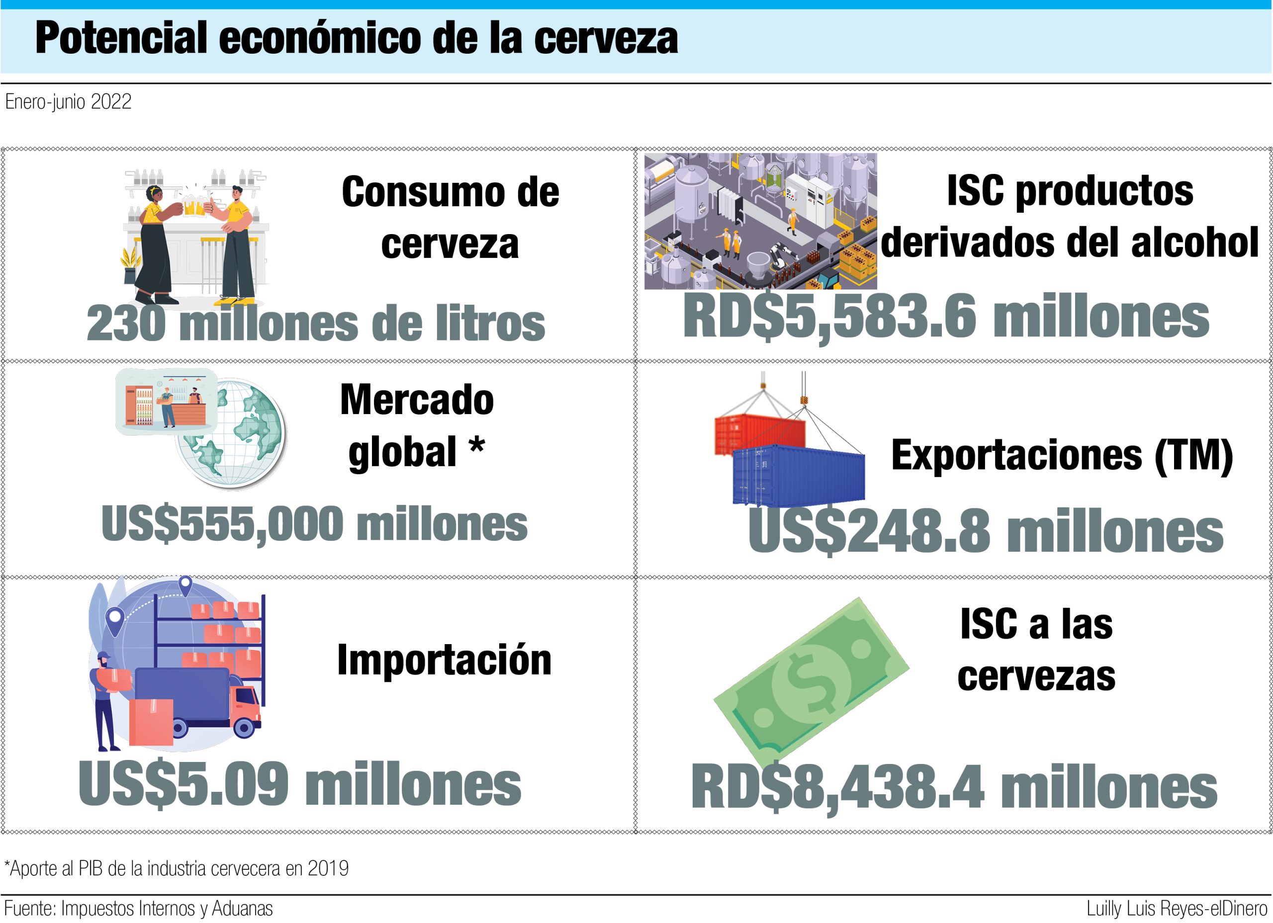 Con un grado promedio de 4% de alcohol, la cerveza es la bebida preferida por muchos dominicanos. La Dirección General de Impuestos Internos (DGII) señala que durante enero-junio 2022, los comerciantes reportaron 9,200,389 litros de alcohol puro en cervezas vendidas. Esto significa que la cantidad de cerveza comercializada en el período fue de 230 millones de litros.