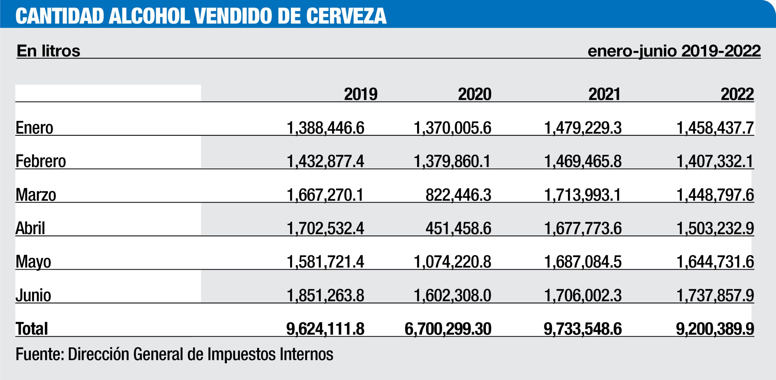 De acuerdo con las estadísticas de la DGII, en el primer semestre de este año la comercialización de cervezas fue 5.1% menos que el 2021 (9.7 millones de litros de alcohol en esa bebida), pero un 37.3% más que 2020 (6.7 millones litros de alcohol), pero un 4.1% menos que en el año de la prepandemia (2019) cuando se registró 9.6 millones de litros de alcohol vendidos en ese producto.
