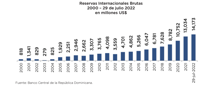 En ese sentido, la evolución positiva de las actividades generadoras de divisas, incluyendo la entrada de remesas por RD$5,669.7 millones en enero-julio de 2022, favoreció la estabilidad relativa del tipo de cambio, reflejada en una apreciación acumulada de la moneda local de 5.3% al cierre de julio y que ha superado el 7% hasta la última fecha disponible de agosto, tanto en términos acumulados como interanuales.