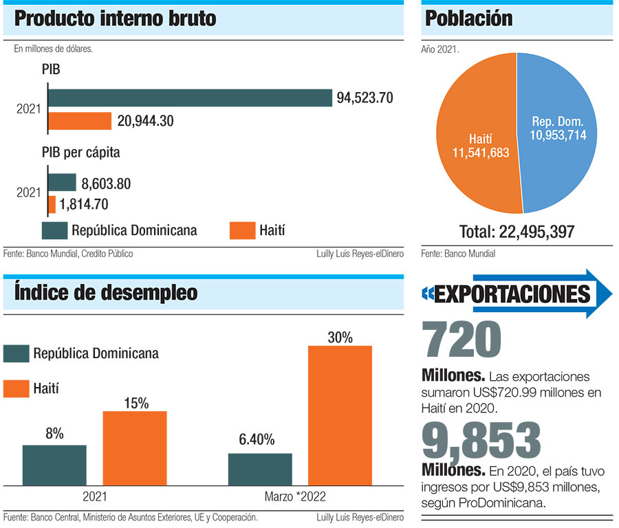 La población estimada de la vecina nación es un 5% más grande en comparación con República Dominicana. Mientras la de Haití está en 11,541,683, la dominicana es aproximadamente 10,953,714. Esto significa que el PIB per cápita (US$ actuales) tiene una diferencia porcentual de casi 80%. Es decir, la dominicana (US$8,603.8) es casi cinco veces la haitiana (US$1,814.7) al 2021.