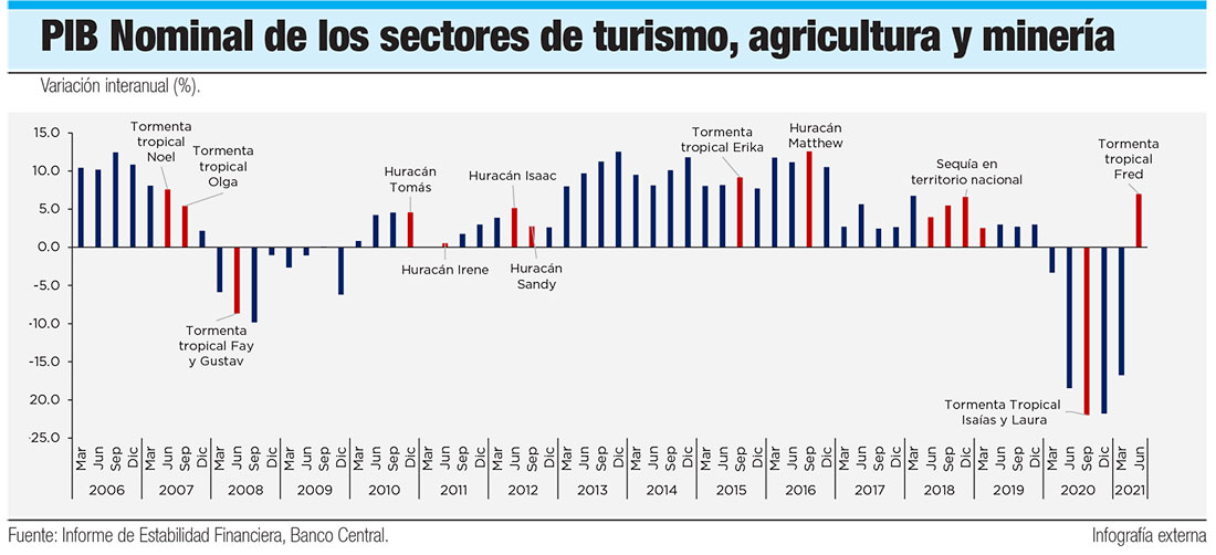 Por sectores, los más vulnerables ante huracanes, tormentas y sequías son la agricultura, el turismo y la minería, cuyos ingresos son equivalentes al 14.6% del PIB. “Luego de un evento climático la producción agrícola se reduce, la infraestructura hotelera se afecta y disminuye la entrada de turistas al país”, destaca en su informe la entidad monetaria que explica de que, luego del paso de fenómenos atmosféricos, la llegada de pasajeros extranjeros disminuye en 4.3%, lo que restringe en un 1.8% la actividad hotelera.