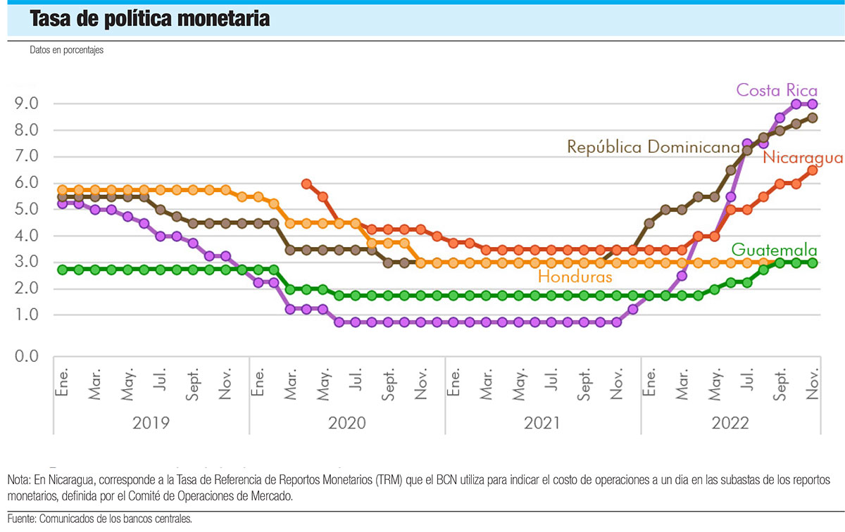 Nicaragua, un poco tímida frente a las decisiones drásticas de las autoridades dominicanas y costarricenses, se mantuvo en aproximadamente 3.50% anual de febrero de 2021 a igual mes de 2022 cuando comenzó a subir su tasa, llevándola a 4%.