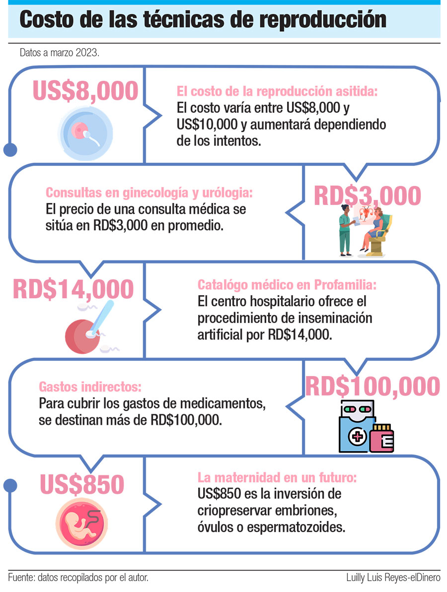 En República Dominicana, estos costos dependen de la clínica a asistir y el tipo de técnica que realice el paciente. Además, los galenos consultados por el medio afirman que con cada resultado negativo, las parejas deciden intentarlo una vez más, lo que duplica el costo.