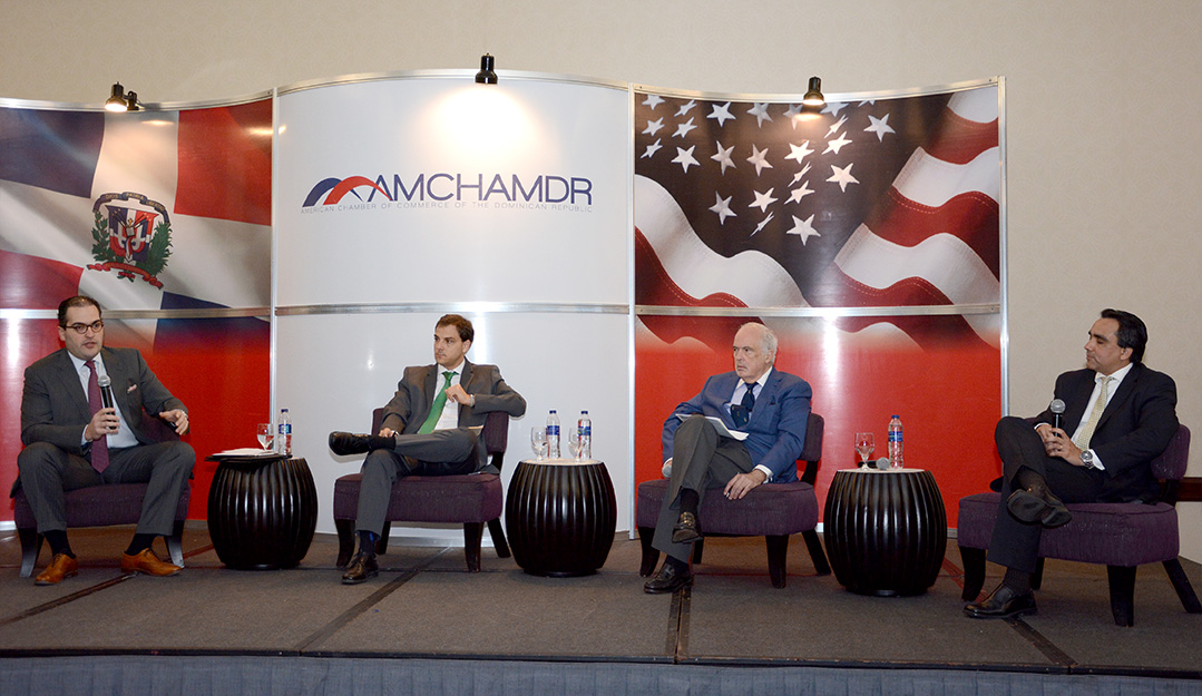 Durante un desayuno organizado por el Comité Económico de la Cámara Americana de Comercio (Amcham-DR) participaron los economistas Bernardo Vega, Martín Francos, director de la carrera de Economía de la Pontificia Universidad Católica Madre y Maestra (PUCMM), y Juan Reyes, viceministro de Competitividad Nacional del Ministerio de Economía, Planificación y Desarrollo (MEPyD), moderados por el presidente del Comité Nassim Alemany.
