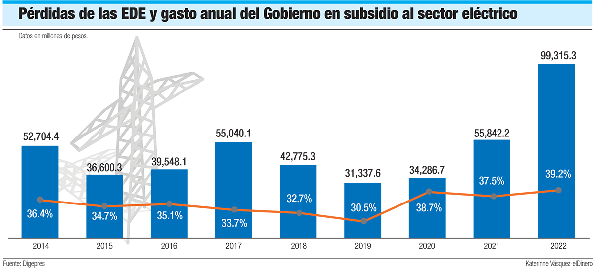 El subsidio al sector eléctrico crece a niveles mucho más altos que la proporción en que también aumentan las pérdidas de las empresas distribuidoras de electricidad (EDE), lo cual se ha convertido en uno de los principales componentes de gastos del Gobierno Central.
