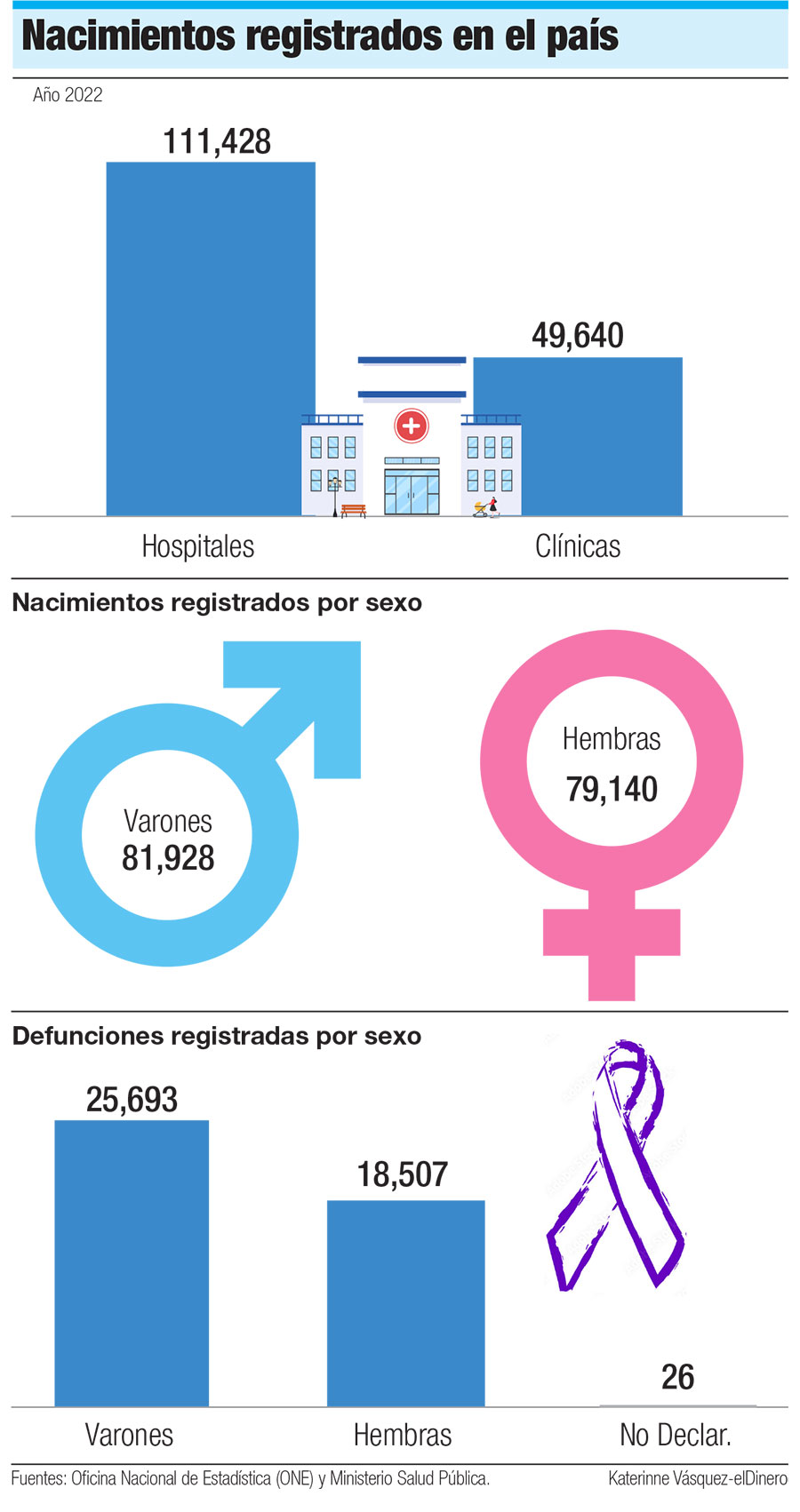 De acuerdo con la Oficina Nacional de Estadística (ONE) durante el pasado año 2022 se registraron 161,068 nacimientos, de los cuales, 111,428 fueron recibidos en hospitales públicos, mientras que en las clínicas privadas nacieron 49,640.