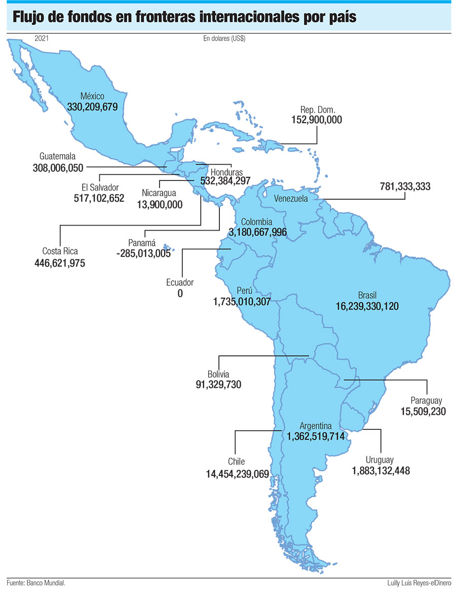 En ese mismo orden, los inversionistas brasileños invirtieron US$19,157 millones. Por su parte, la salida de divisas de Chile fue de alrededor de US$14,454 millones (un aumento del 116% con respecto a 2020), que fue también una de las cifras más altas de la última década.