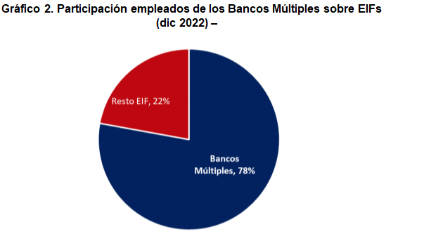 Entre 2014 y 2022, de acuerdo a estadísticas de la Superintendencia de Bancos, la cantidad de empleados de las Entidades de Intermediación Financiera (EIF4) pasó de 36,040 en 2014 a 43,475 en 2022, para un aumento acumulado de 7,435 empleos (21%). De ese total, los bancos múltiples con 33,853 empleados (el 78%) son los mayores empleadores. (gráfico 2).