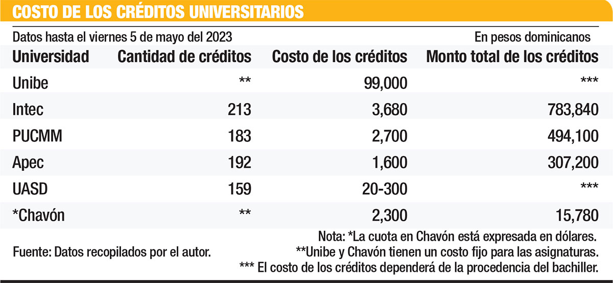 Un crédito cuesta RD$1,600, pero al multiplicar este monto por los 192 créditos de las 66 asignaturas plasmadas en el pénsum el costo asciende a RD$307,200.